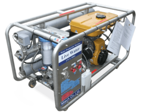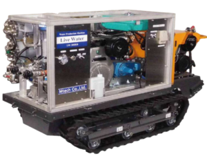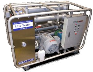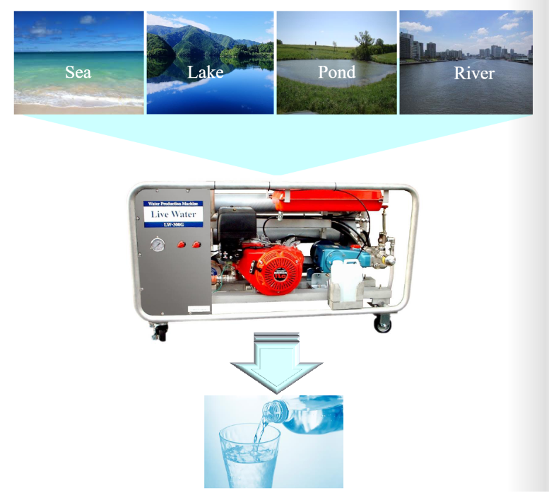 "Live Water" uses reverse osmosis to separate components. Using a reverse osmosis membrane (RO membrane), seawater is pressurized and sent by a pump to efficiently create fresh water. Reverse osmosis can remove bacteria, viruses, fine particles, salt, heavy metals, and organic matter in water. Therefore, it is possible to produce safe drinking water.